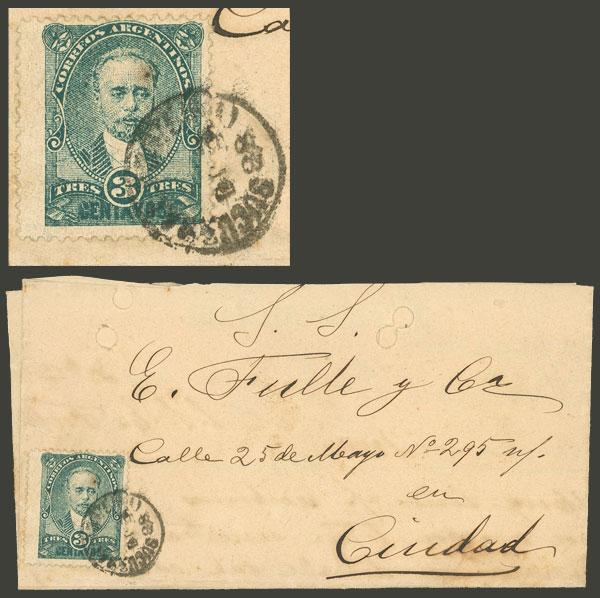 GJ.83, 1888 3c. Juárez Celman franking alone a postal memorandum used in Buenos Aires on 3/DE/1888, with punch holes but all the same VF! (Image)