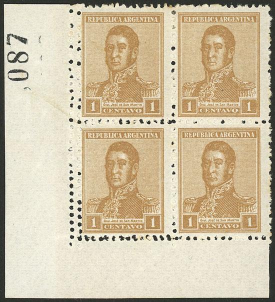 GJ.458, 1918 San Martín without watermark 1c., block of 4 with DOUBLE PERFORATION in left half, excellent! (Image)