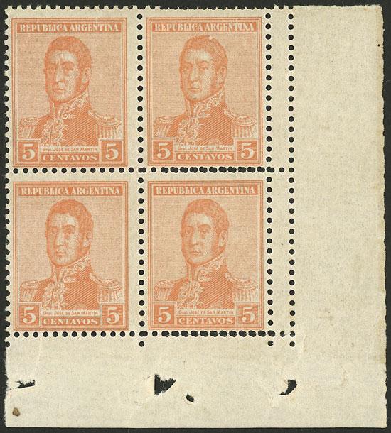 GJ.462, 1918 San Martín without watermark 5c., block of 4 with DOUBLE PERFORATION in right half, excellent! (Image)