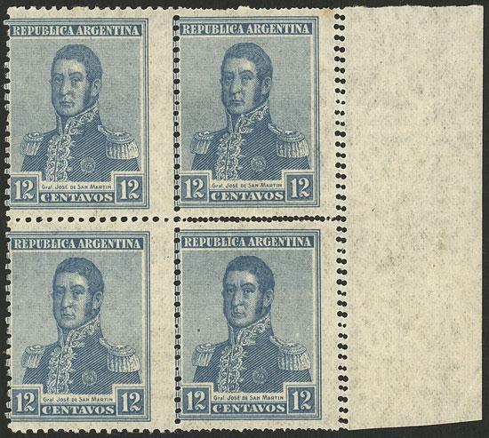 GJ.506, 1920 San Martín 12c. with multiple suns wmk, block of 4 with DOUBLE PERFORATION in right half, very fine quality! (Image)