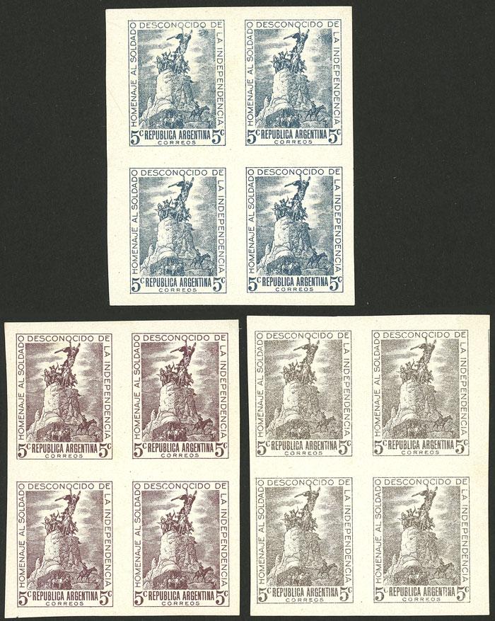 GJ.926, 1946 Monument to the Unknown Soldier, 3 different COLOR PROOFS in block of 4, very attractive group! (Image)