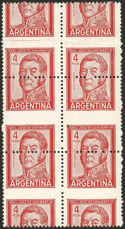 GJ.1139A, San Martín 4P., block of 6 with dramatically shifted perforation, spectacular! (Image)