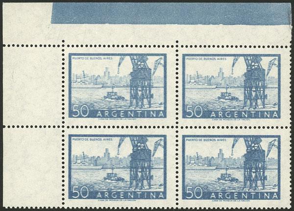 GJ.1043a, Port of Buenos Aires with COMPLETE DOUBLE IMPRESSION variety, corner block of 4, MNH, excellent quality! (Image)
