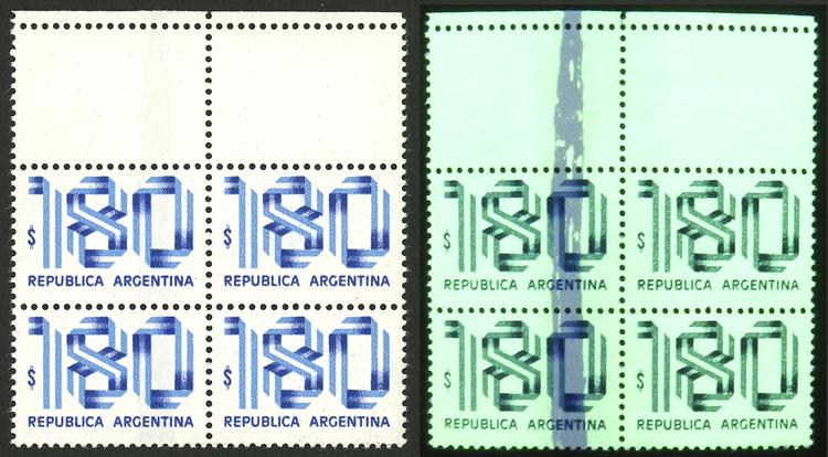 GJ.1861NS, Ribbons 180P., block of 4 with top labels printed on phosphorescent unsurfaced paper, the left stamps with band of UV NEUTRAL PAPER, very fine quality, very rare (Image)