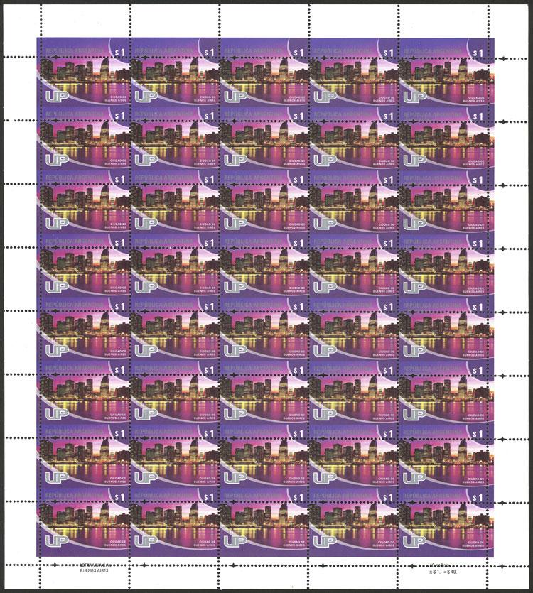 GJ.3715, 2008/14 1P. Buenos Aires city, complete sheet with VERY SHIFTED PERFORATION (the bottom stamps WITHOUT face value, the rest with the value below!), market value US$250 or more, excellent opportunity! (Image)