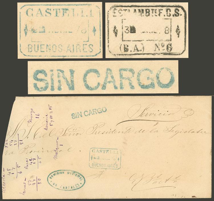 Official cover sent from CASTELLI to Buenos Aires on 2/AP/1878, with the blue marks "SIN CARGO" (straightline) and rectangular datestamp of CASTELLI, on back "EST. AMBULANTE F.C.S. - (B.A.) Nº6" for 3/AP, with opening defect but very nice and rare! (Image)
