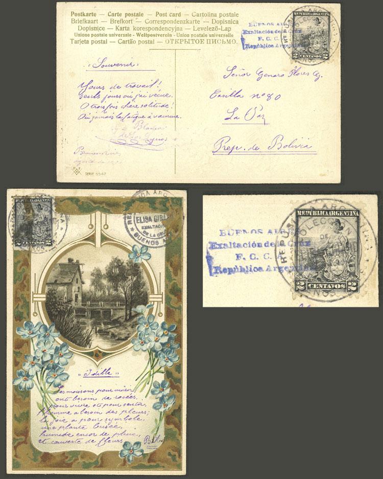 PRIVATE CANCEL: Postcard sent from Exaltación de la Cruz to Bolivia franked with 4c. (2x 2c. Seated Liberty) with private cancel of the sender, interesting! (Image)