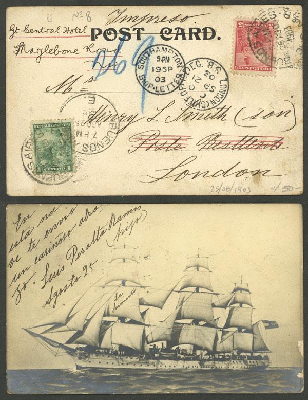 Beautifu postcard with view of the FRIGATE SARMIENTO at sea, sent from Buenos Aires to England on 25/AU/1903 franked with 6c., VF! (Image)