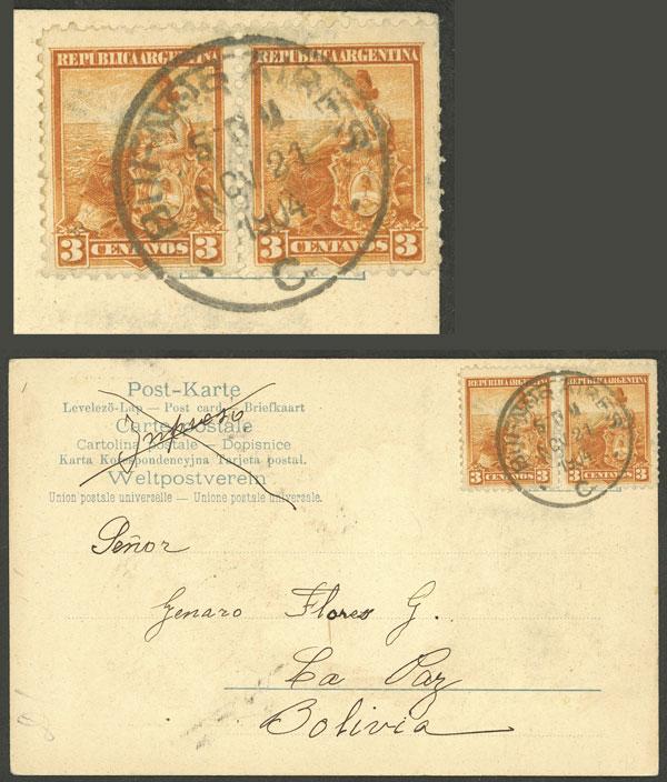 RARE DESTINATION: Postcard sent from Buenos Aires to Bolivia (very uncommon destination despite being neighboring countries!) on 21/NO/1904, franked with 6c. (pair of 3c. Seated Liberty), excellent! (Image)