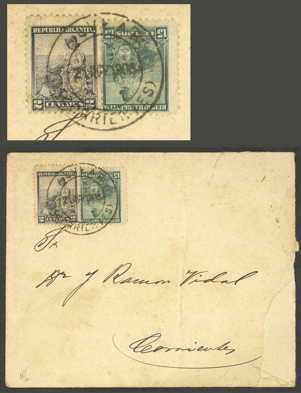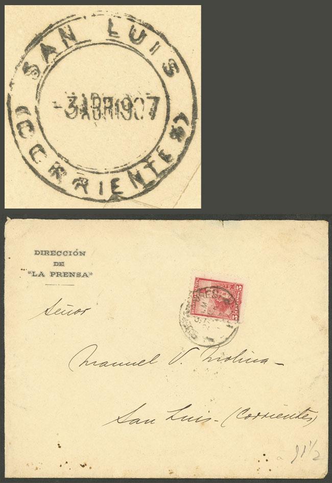 RARE CANCEL: Cover sent from Buenos Aires to San Luis (Corrientes) on 27/MAR/1907 franked with 5c. Seated Liberty, on back transit mark of Corrientes 31/MAR and SAN LUIS arrival for 3/AP, rare! (Image)
