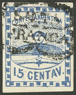 GJ.3, 15c. blue, with wreathed "SALTA -FRANCA" cancel (+60%), excellent quality, with Alberto Solari certificate (Image)