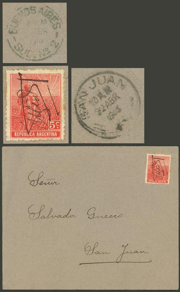 Unsealed cover (it contained printed matter of commercial papers) sent to San Juan franked with 5c. Plowman, with rare pen cancel. On back it has a cancel of Buenos Aires and arrival mark of 22/AP/1914, excellent quality! (Image)