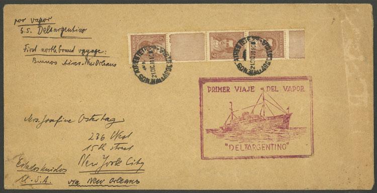 21/DE/1940 Buenos Aires - New York, cover carried on the first trip of steamer Deltargentino, with special handstamp, good franking (Moreno 5c. with gutter), and on back arrival mark of New Orleans, VF! (Image)