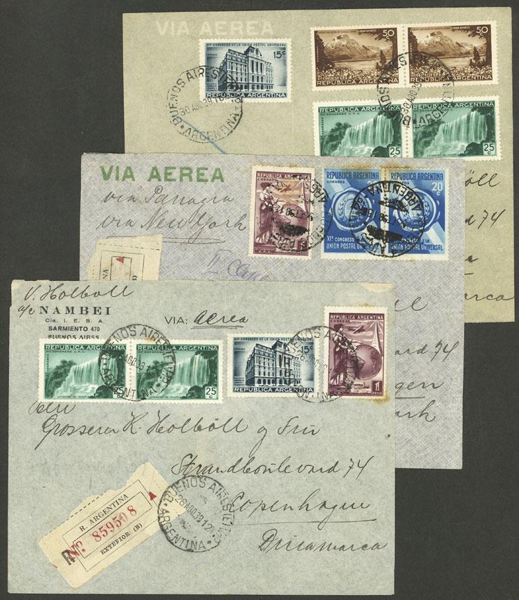 3 Registered airmail covers sent to Denmark between August and September 1939, 2 by Cóndor franked with 1.65P. and another one by PANAGRA (1.90P rate), the latter with transit marks of Cristobal and New York, interesting lot! (Image)