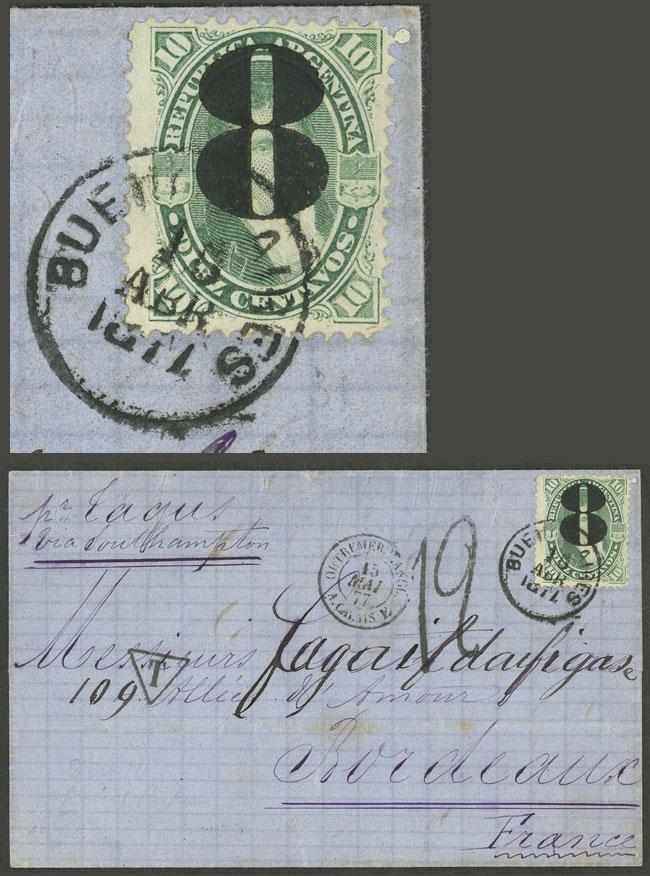 GJ.47, 1877 provisional of 8c., franking a folded cover sent from Buenos Aires to France on 15/AP/1877 by English steamer "Tagus, via Southampton", very fine quality! (Image)