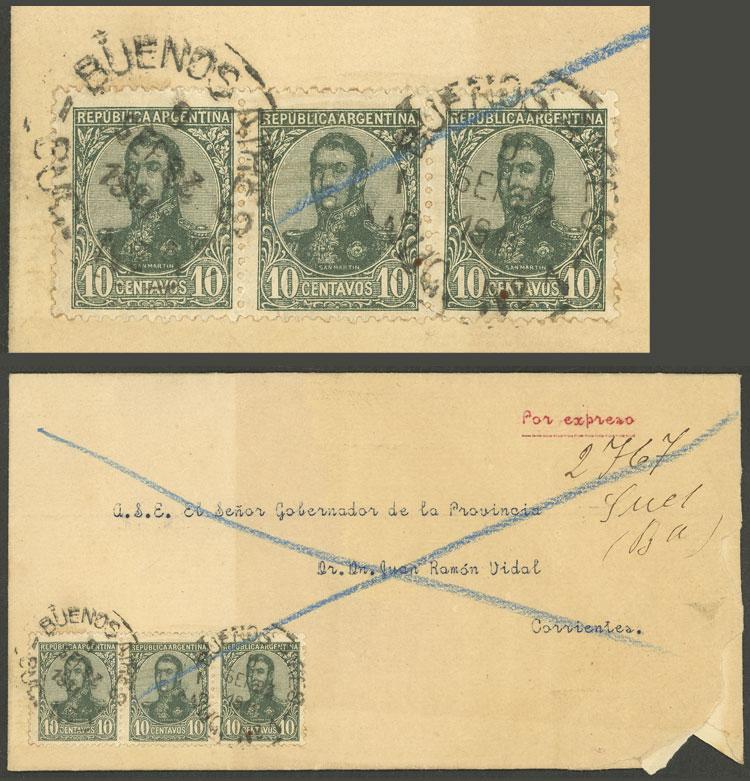 GJ.282, 1908 10c. San Martín in oval, strip of 3 franking a cover sent by express mail from Buenos Aires to Corrientes on 28/SE/1911, very attractive! (Image)