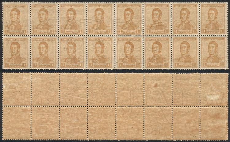 GJ.480, 1918 1c. San Martín, block of 16 of which 12 have Wheatley Bond watermark (COMPLETE), MNH (+50%, 2 with light hinge mark), premium quality, rare showing the complete watermark! (Image)