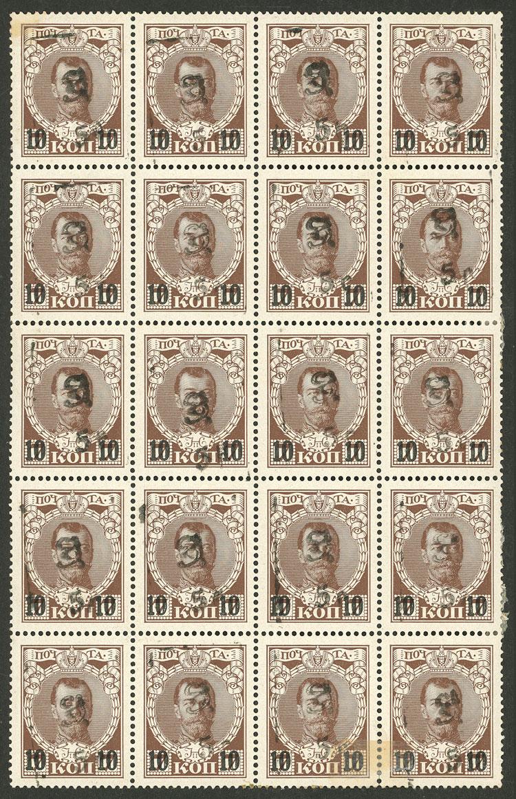 Sc.196, 1920 Russian stamps of 1916 with 5r. overprint on 10k on 7k., MNH block of 20 (a few lightly hinged), excellent quality! (Image)