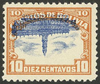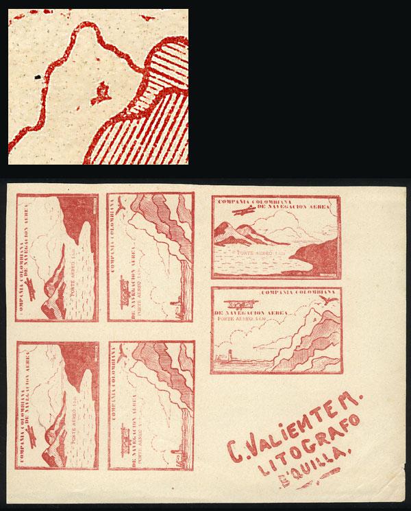 Yvert 11, 10c. carminish red (airplane and mountains), corner block of 6, with the 2 different cinderellas and the printer imprint. The lower right stamp with VARIETY: "window in the mountain", mint no gum as issued, excellent quality, catalog value Euros 480++ (Image)