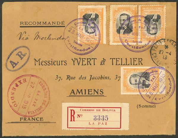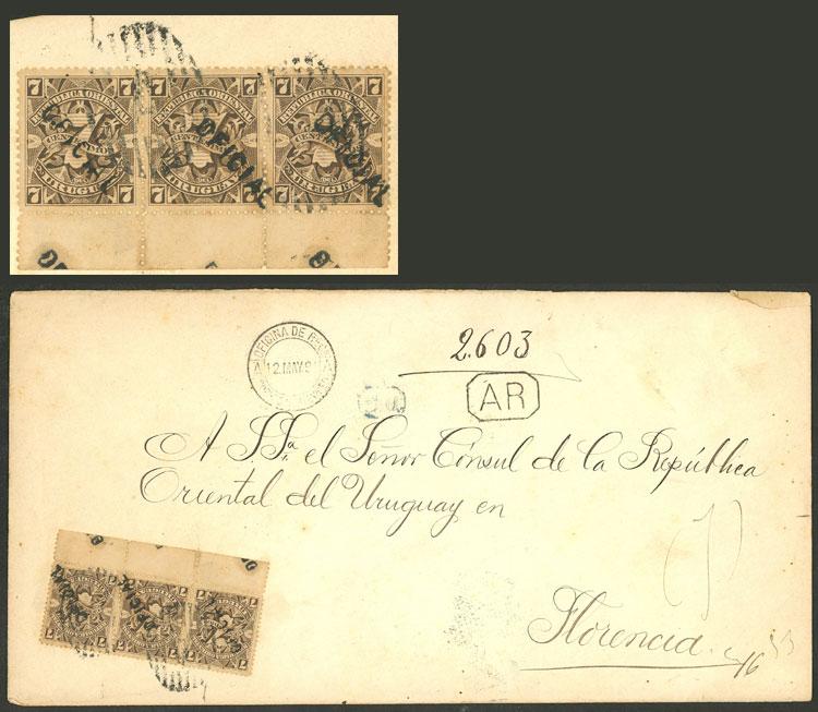 Sc.O49, 1889/901 7c. dark chestnut, strip of 3 franking a registered cover with AR sent from Montevideo to Italy on 12/MAY/1894, with Firenze arrival mark on back, very fine quality, rare. Ex-Loeb, its price was US$450 (Image)