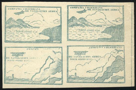 Yvert 10, 10c. green (airplane and mountains), block of 4 of the 2 different cinderellas, mint no gum as issued, excellent quality. Signed by Alberto Diena, catalog value Euros 320. (Image)
