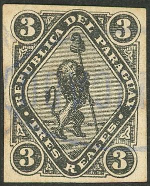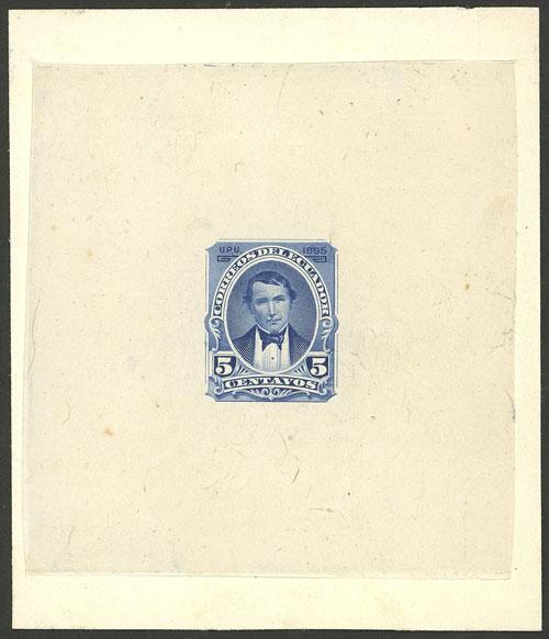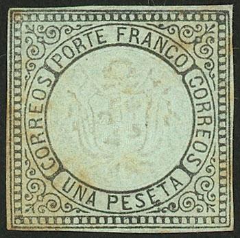 Sc.13, 1863 1 Peseta, PROOF on bluish paper, light thin on back, very good front, rare! (Image)