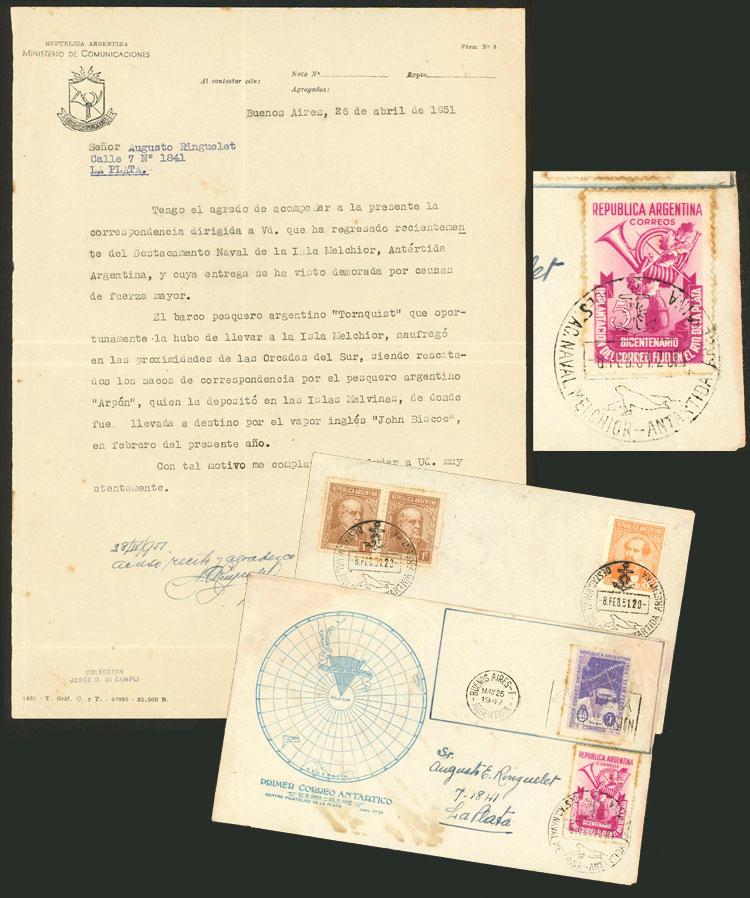 SHIP WRECK: FDC cover commemorating the first Antarctic mail (25/MAY/1947), re-franked and sent from Melchior Antarictic base to La Plata on 8/FE/1951, with evident signs of effect of water damage, with a letter of the Argentine Post indicating that this piece was carried by the SHIPPING BOAT TORNQUIST that SUNK near the South Orkneys, and the mail sacks were rescued by the Argentine fishing boat "Arpón" that took them to the Falkland Islands, from there the mail was taken to destination by the English steamship "JOHN BISCOE". We also include a cover sent on the same day from Melchior to Buenos Aires, with arrival mark on back of 27/AP/1951, very attractive lot! (Image)