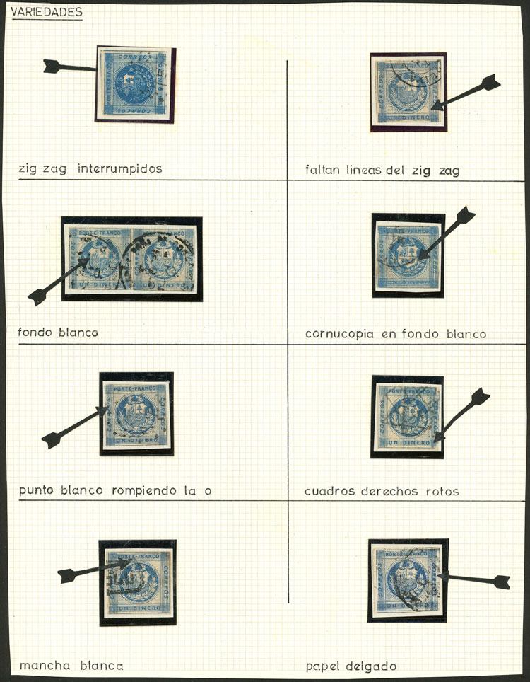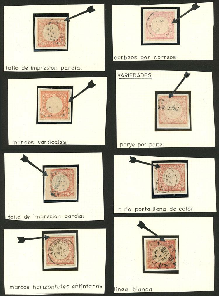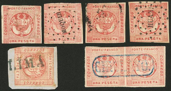 Yvert 7d, 1860 1P. red pair with WHITE FLAGS (second retouch), pair (with attractive blue cancel "CHICLAYO") + 5 singles, varied shades and cancels, attractive lot! (Image)
