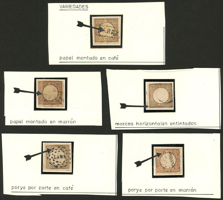 Yvert 9, 1862 1P. brown, 5 stamps with varieties, from an old collection, very nice lot! (Image)