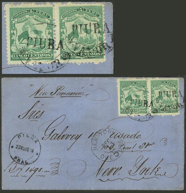 Yvert 10 (Sc.16), 1866 Llama 5c., pair franking a folded cover sent from Piura to New York on 23/NO/1876 "via Panama", cancelled by "PIURA - VAPOR", datestamp of origin, and postage due mark of 5c. applied on arrival on 13/DE, excellent quality, rare. Ex-Herbert Moll (Image)