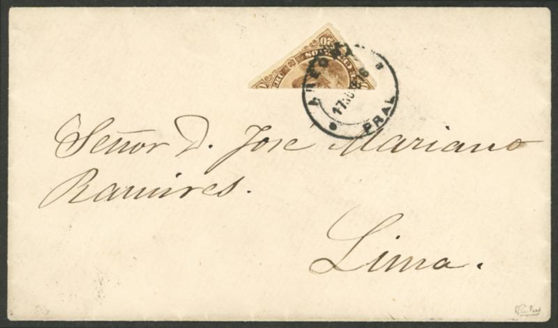Yvert 12a, 1866 20c. Llama diagonal BISECT used as 10c. on a cover sent from Arequipa to Lima on 17/NO/1876, a few days after the withdrawal of authorization to use bisected stamps due to the shortage of 10c. stamps (the authorization was made on 9/SE/1876 and it was withdrawn on 1/NO/1876). Excellent quality, very rare, ex-Herbert Moll. (Image)