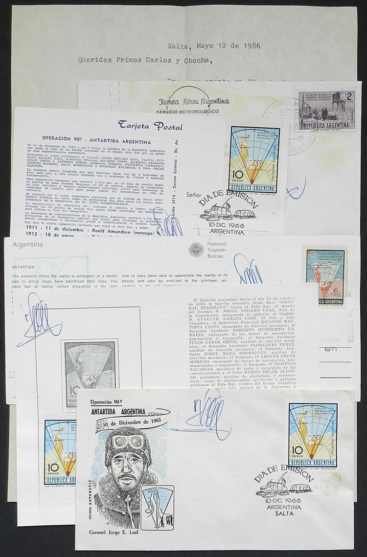 Lot of 5 covers and cards with the handwritten signature of Argentine Antarctic explorer JORGE LEAL, chief of the first Argentine expedition to the South Pole in 1965 and founder of the Esperanza station in 1952. We also include a letter of a stamp collector of Salta, where he indicates to some relatives that would be meeting Gral. Leal in 1986 that he was including those items for the General to sign. Interesting historical lot with the signature of one of the best Argentine explorers of the White Continent! (Image)