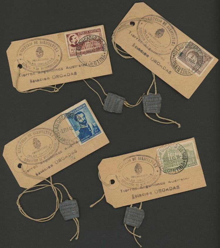 4 Tags for mail sacks with several different postages and postmarks "ISLAS ORCADAS DEL SUR - 2/FEB/42", also of oval mark of the sender: "Ministerio de Agricultura - Observatorio Islas Orcadas - Dirección de Meteorología", and joined by a string to a metallic seal with embossed inscription: "CORREOS - ARGENTINA" and on back: "ISLAS ORCADAS DEL SUR", excellent quality and very rare lot, unique opportunity for the specialist! (Image)