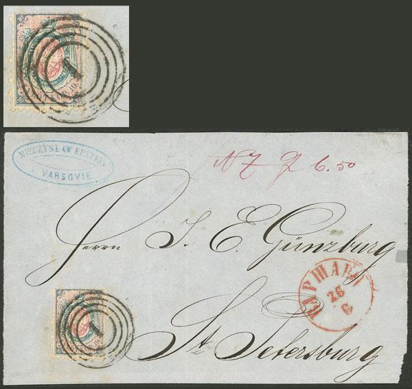 Sc.1, 1860 10k. blue and rose, franking a front of folded cover sent to St. Petersburg, excellent quality! (Image)