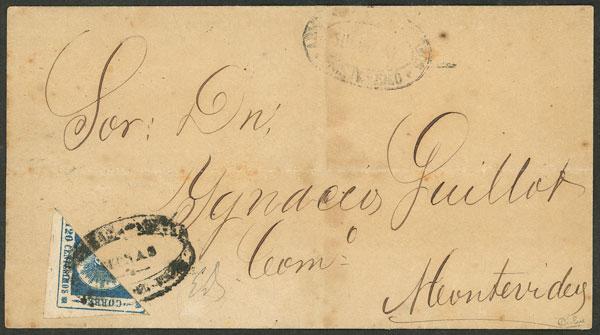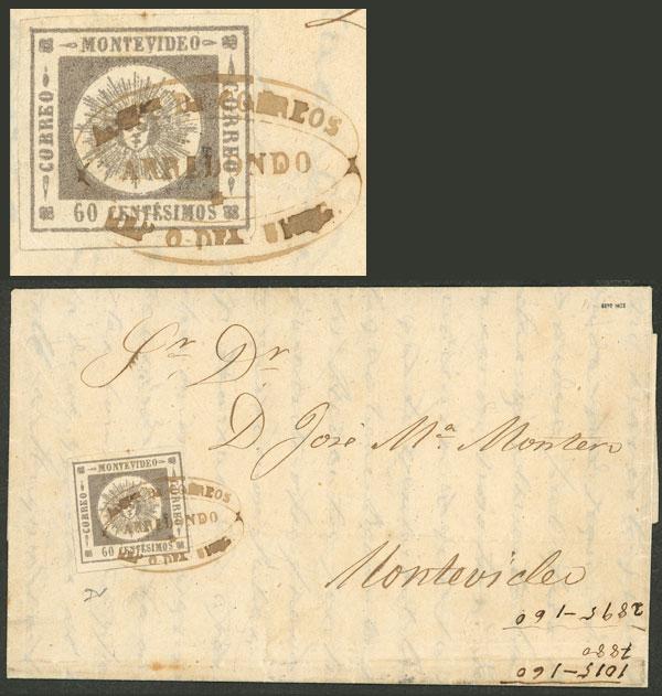 Yvert 7a, 1859 60c. Sun with thin figures, lilac-gray, franking an entire letter sent from ARREDONDO to Montevideo on 7/SE/1859, light crease of little importance, excellent appearance, rare mark. With certificate of Fausto Diaz Paulos. (Image)