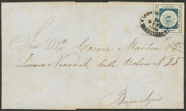 Yvert 10b., 1959 Sun with thin figures 120c. dark blue, beautiful example franking an entire letter sent from Montevideo to Buenos Aires on 20/DE/1859, very fine quality, with Carlos Hernández Rocha certificate indicating that no more than 5 covers with this color are known! (Image)
