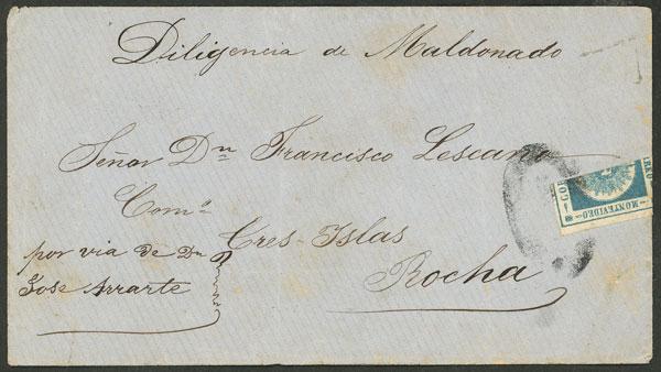 Yvert 16a, 1860/2 120c. Sun with thick figures, horizontal BISECT used as 60c. franking a cover sent from Montevideo to Rocha, very fine quality, with Hernández Rocha certificate (Image)