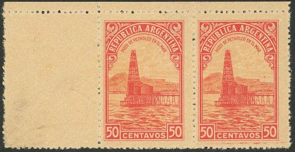 GJ.759, 1935 50c. Petroleum, COLOR PROOF, extremely rare pair WITH LABEL at left, one of the 2 or 3 known copies, excellent quality (Image)
