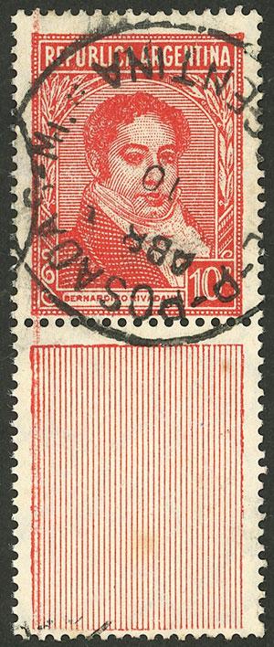 GJ.798CJ, 10c. Rivadavia WITH DECORATED LABEL BELOW from the gutter, used in Posadas, very fine quality, very rare. This label will be included in the next edition of the GJ catalog with a value (mint or used) of US$350 (Image)