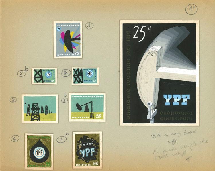 GREAT RARITY: GJ.1592, 1972 50th anniversary of YPF(Yacimientos Petrolíferos Fiscales), folder with the designs presented by the illustrator H.Viola, including one very similar to the adopted one. Originally they had a value of 25c., and beside the selected design there is an inscription in pencil "This one is very good, couldn't it have a higher value?", eventually the stamp was issued with a face value of 45c., excellent quality, unique and unrepeatable lot! (Image)