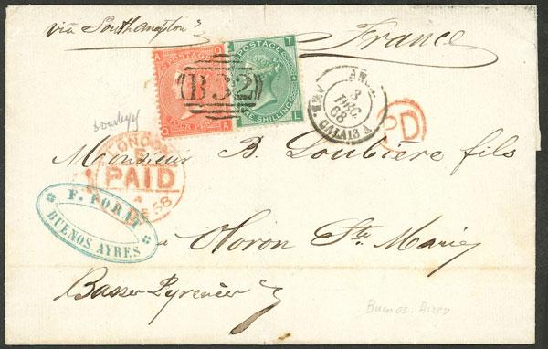 27/OC/1868 Folded cover sent from Buenos Aires to France by English mail, franked with 1s. 4p. and spectacular "B32" cancel perfectly applied over the stamps, on back datestamp of the English offices in Buenos Aires, London transit mark, etc., excellent quality! (Image)