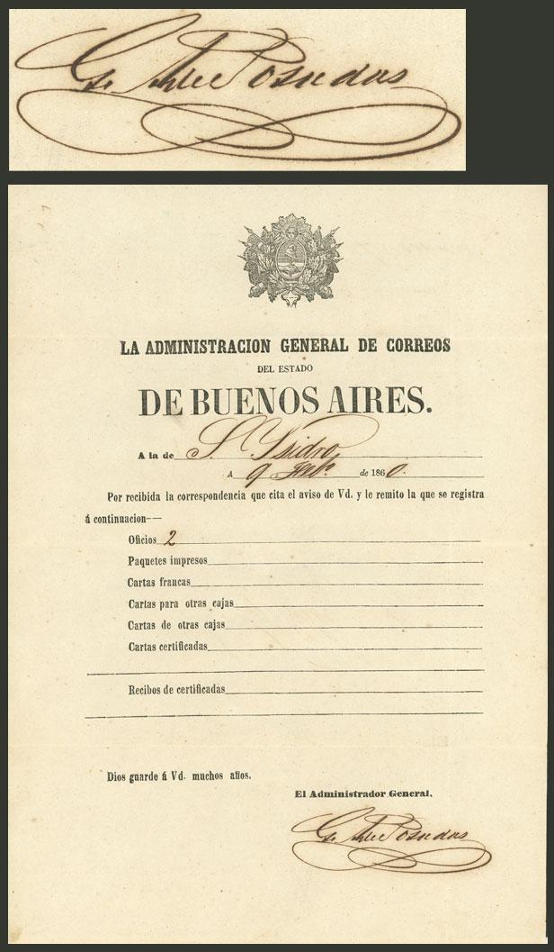 Receipt of the Postal Administration of the State of Buenos Aires for 2 official documents sent from San Isidro, with the hand-written signature of General Postmaster Gervasio de Posadas, excellent quality, rare! (Image)