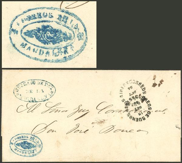 Rare roccoco cancel of "CORREOS DE LA MAGDALENA" in blue, on a folded cover to Buenos Aires, with arrival mark for 15/OC/1864, excellent quality, with Alberto Solari certificate, very scarce. GJ catalog value US$800 (see page 647, volume II) (Image)