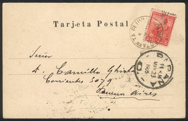 PC sent from Rosario to B.Aires on 23/MAY/1905, franked by GJ.222, with rare "ESTAFETA FLUVIAL Nº10" cancel, transit backstamp of Paraná and arrival of B.Aires, superb, rare! (Image)