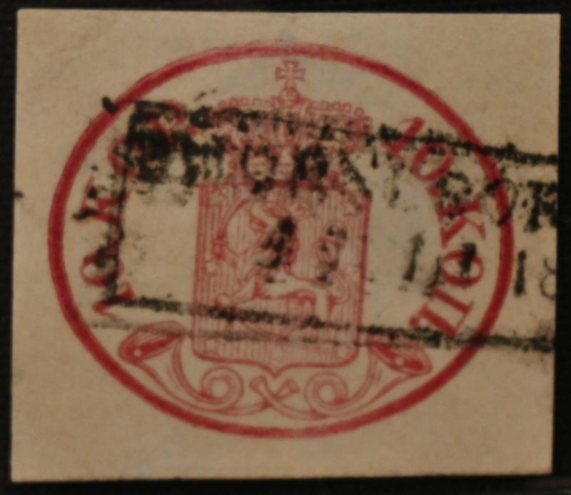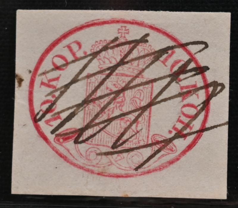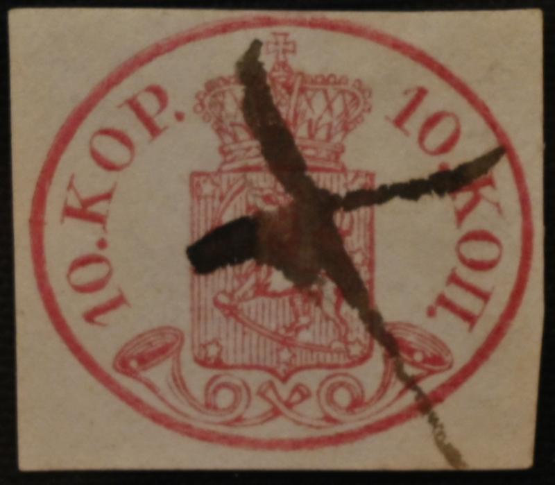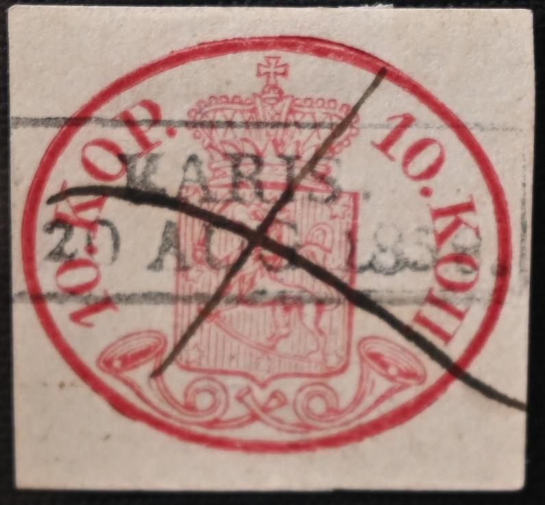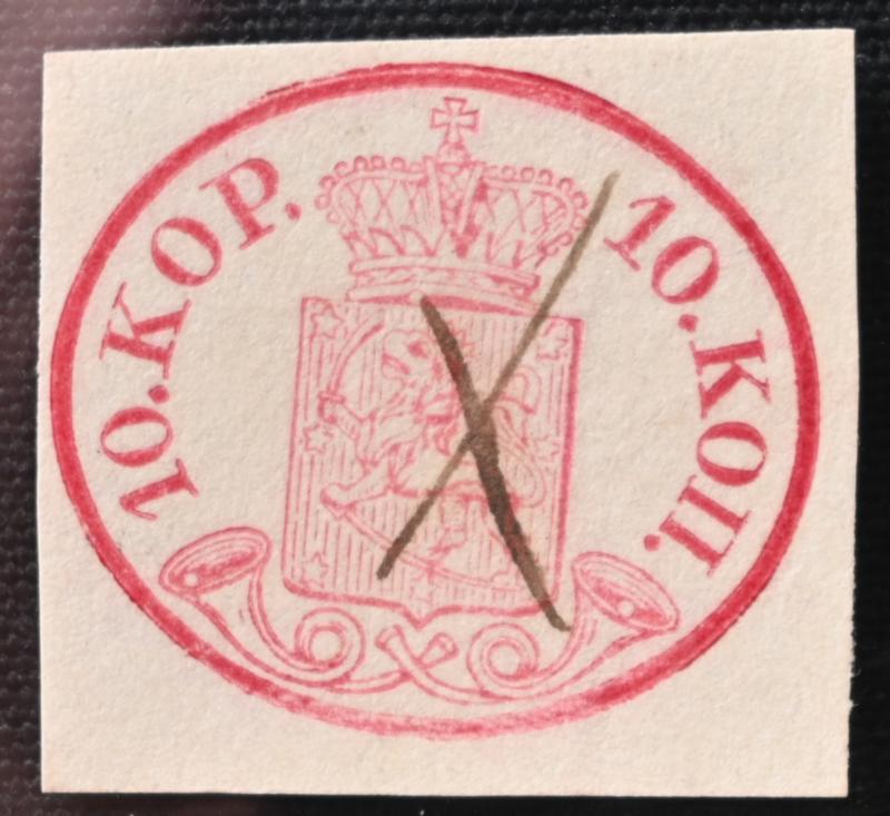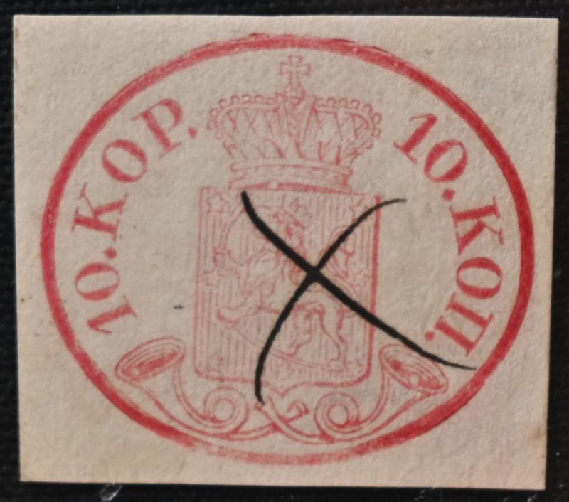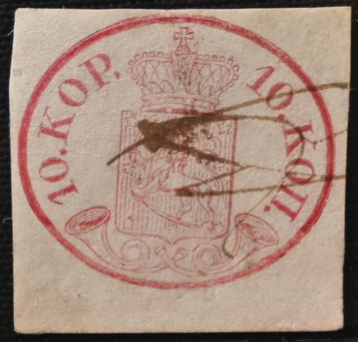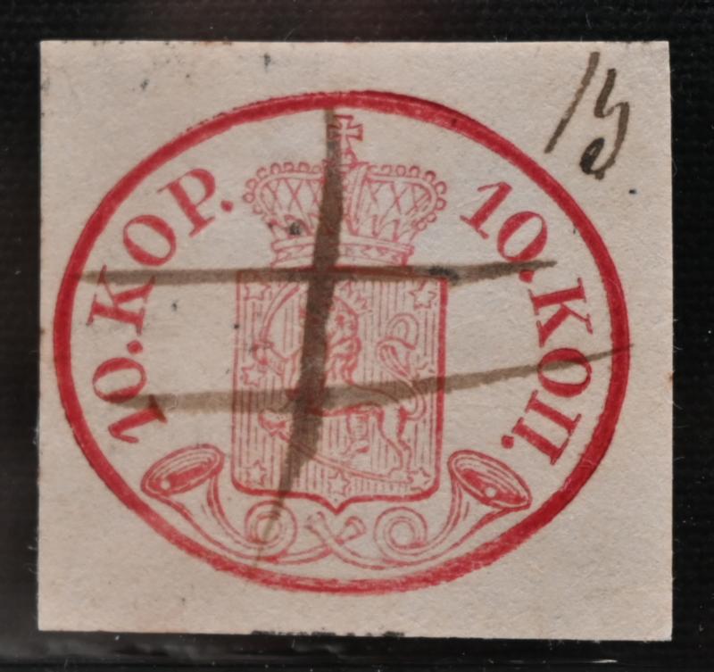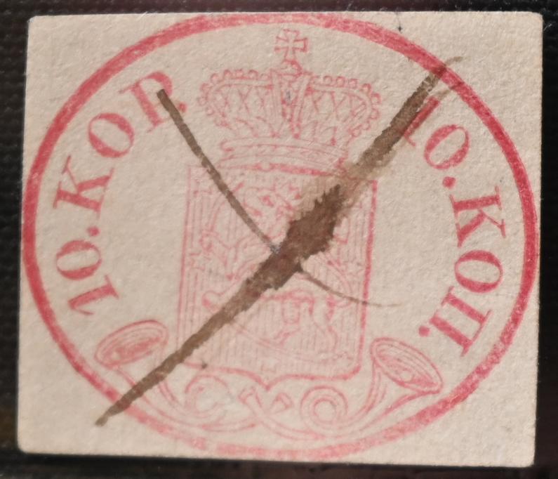 10 kopek carmine-red, fine ink maculation, similar to what has been used eg. in Loviisa. Also chart number 13 on the stamp. A fine stamp! Certificate: Schwenson (2024) (Image)