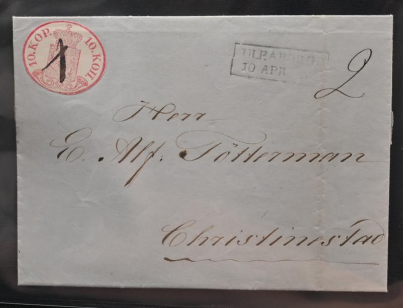 10 kopek carmine-red with a nice ink cross on reverse of the cover to Russia, Åbo 1858 in front. Stamp with wide margins, but one side with small faults because the stamp is in the edge of the cover. Still a magnificent! Some typical patina and creases on cover (L. 2 h). Certificate: Oesch (1999) (Image)