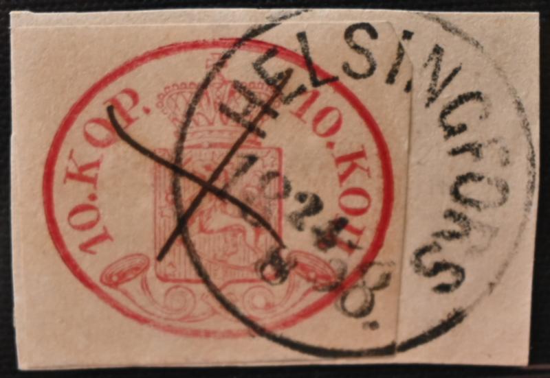 10 kopek carmine-red, wide margins, very fine Helsingfors 1858 and in cross, on a fragment. Fabulous item! (L. 2 h). Certificate: Schwenson (2024) (Image)