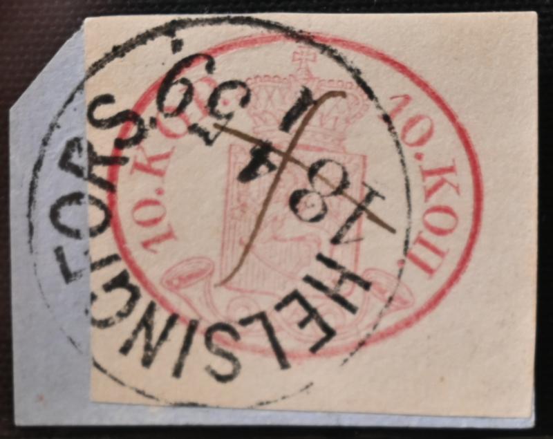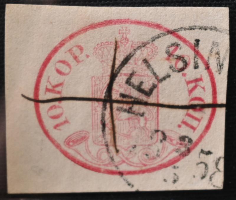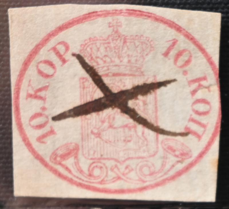 10 kopek carmine-rose, very beautiful Helsingfors 1859 and ink cross, on a fragment. One margin cut in. (L. 2 f). Opinion: Reinikainen (2001) (Image)