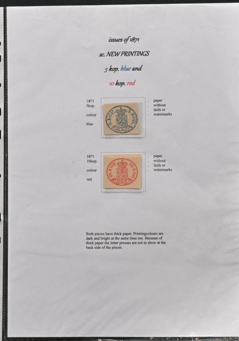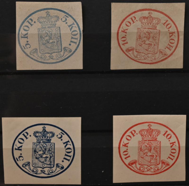 5 kopek large pearls, dark blue, beautiful Helsingfors 1858 and ink cross, on a fragment. Almost invisible horizontal crease (L. 1 IIa). Certificate: Schwenson (2024). Also 10 kopek rose with ink cross and small faults, signed: Schwenson (Image)