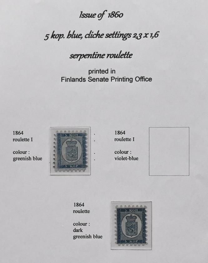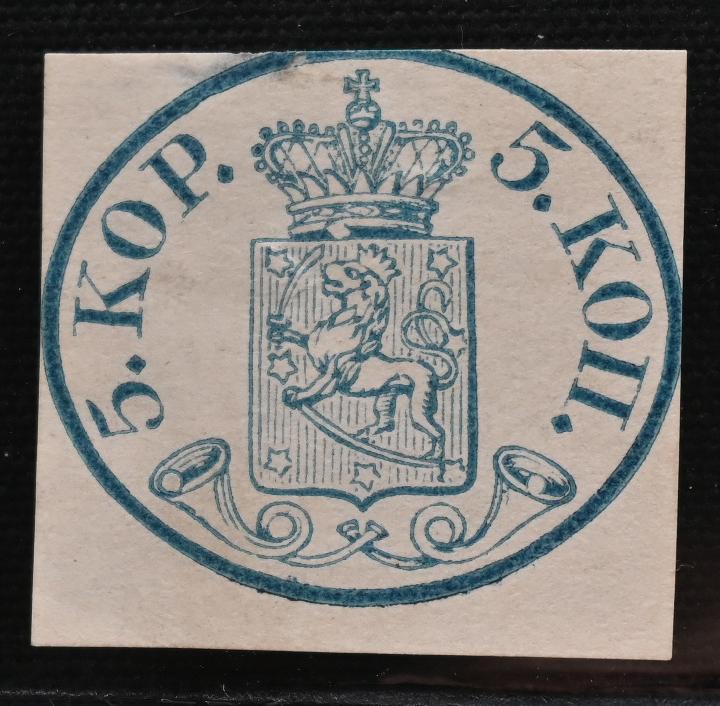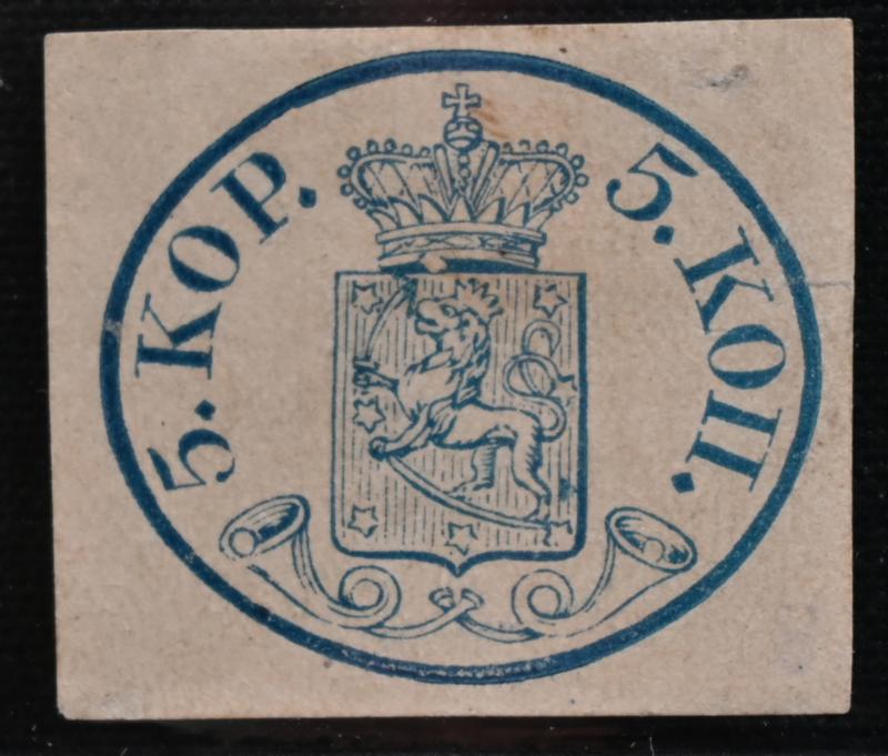 5 kopek small pearls, blue, fine margins, very fine Fredrikshamn 1857 - only postmark. Two small thin spots and a small corner crease. (L. 1 Ib). Certificate: Schwenson (2024) (Image)